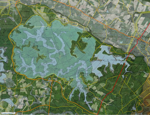 ---------Sa superficie de 48 km² en fait le plus grand lac artificiel d’Europe (pour sa superficie). Sa capacité nominale est de 350 Mm3.