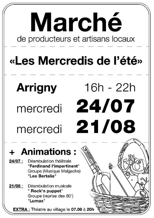 Derniers articles publiés Le Comité d’Animation d’Arrigny renaît de ces cendres. La fête patronale est de retour. L’affichage municipal change de place. Le marché du mercredi 24 juillet 2014. Les mercredis de l’été. Fête nationale du 14 juillet 2024 Marathon du Der 2024. Commémoration du 8 mai 1945. Concert dans l’église. Chasse aux œufs de Pâques 2024. page précédentepage suivante derniers commentaires Février 2022 – Le blason de la commune Février 2014 – Le lever des grues cendrées. Septembre 2012 – Et la vie continue...vers l’an 2000. Juillet 2012 – Le blason de la commune Novembre 2009 – L’église du village Mots-clés 8 mai Activités Brocante Chorale Commémorations Concert Expositions Feu d’artifice Manifestations Musique Directeur de la publication et Responsable de la rédaction Jean Yves Loppin Création Jean Yves Loppin :Version Pdf Version imprimable ** Commune d’Arrigny. Les mercredis de l’été. Jours de marché. par Laurent Bouquet Pour télécharger l’affiche en pdf : cliquez ici Répondre à cet article - Nombre de fois où cet article a été vu- - -